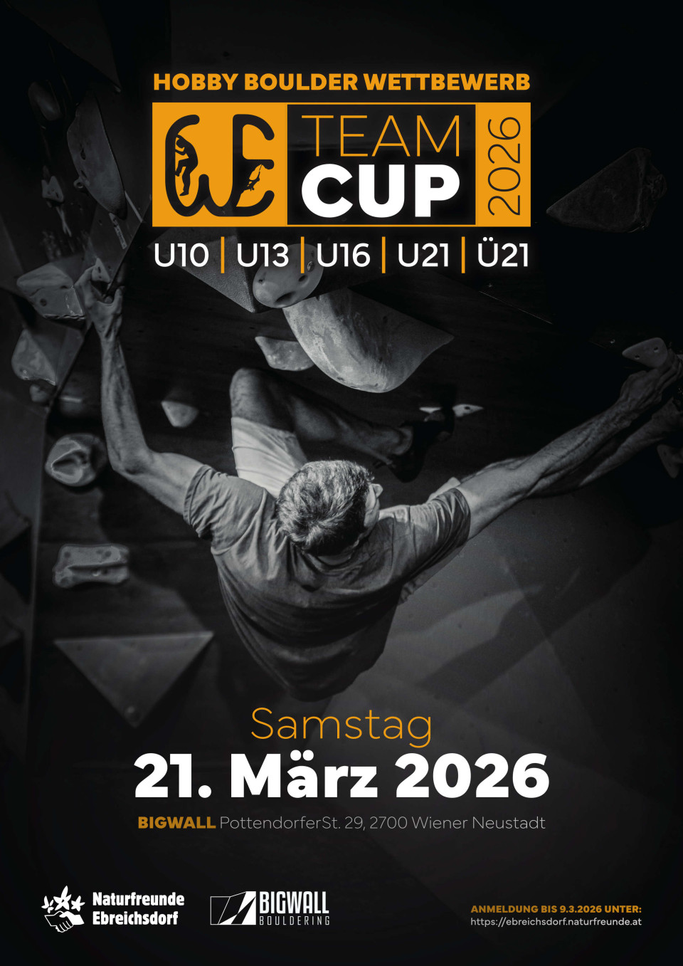 Die Naturfreunde Ebreichsdorf veranstalten heuer den WE TeamCup 2026 im Bigwall Bouldering in Wr. Neustadt und freuen sich auf euer Kommen.
